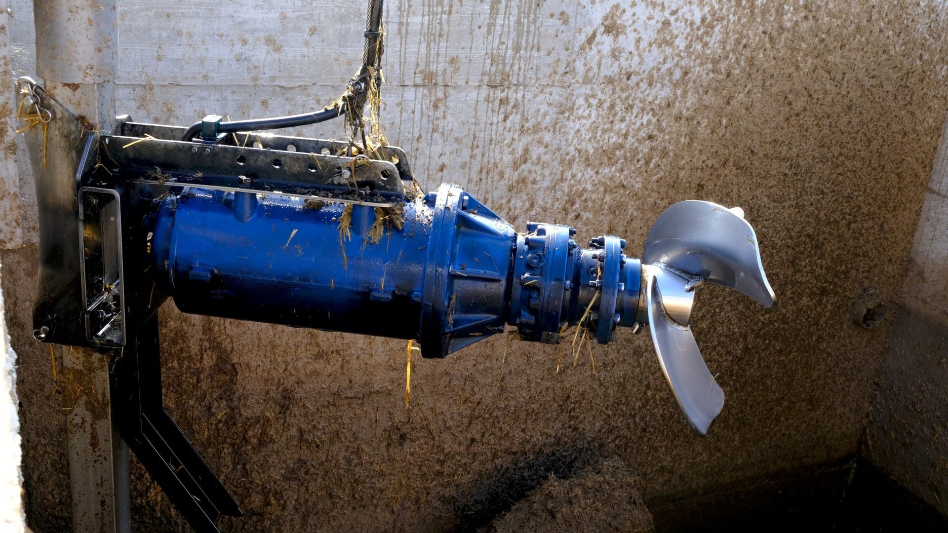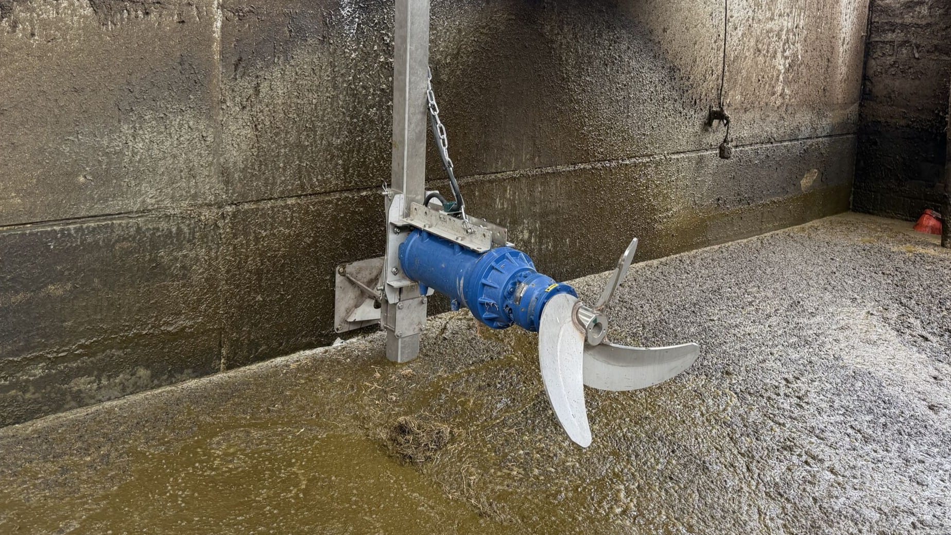 De CHIOR HMT-roerwerk bestaat uit een elektrische motor met een reductiekast, gekoppeld aan een propeller die speciaal is ontworpen om vloeistoffen met een lage tot gemiddelde dichtheid te homogeniseren en in suspensie te houden, zoals varkensmest, rundermest en biogasdigestaat.