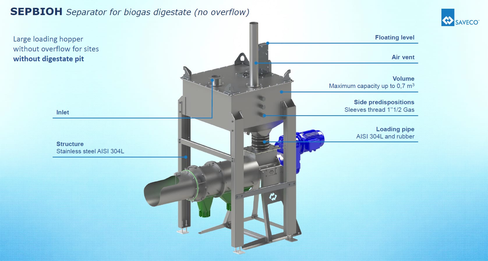 SEPCOM Biogas Horizontal is een machine voor het scheiden van vaste en vloeibare stoffen gebaseerd op schroeftransporttechnologie. De scheiding vindt plaats door middel van zwaartekracht en mechanische compressie en de machine is ontworpen om materialen in de vloeistoffase van de vaste fase te scheiden. Deze materialen zijn onder andere slurry, afvalwater, mest, afval van groente en fruit, en in het algemeen mengsels van vaste en vloeibare stoffen waarin het percentage vloeibare stoffen aanzienlijk kan verschillen. De gescheiden vaste en vloeibare stoffen kunnen eenvoudig en goedkoop worden verwerkt.Â