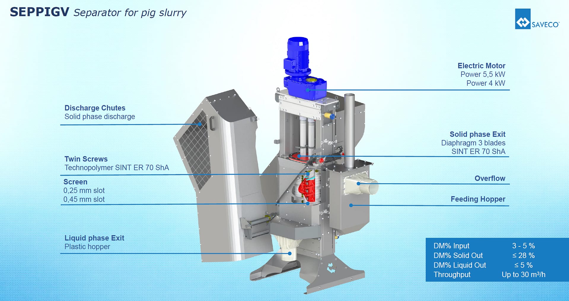 De SEPPIGV, SEPCOM Pig Vertical, is een innovatieve vast-vloeistof-schroefpersscheider. Dankzij de speciale kenmerken, de verticale werkpositie en een dubbelschroefs ontwerp, kan een breed scala aan materialen van biogasinstallaties en industriële processen, maar ook drijfmest van veeteelt worden behandeld.